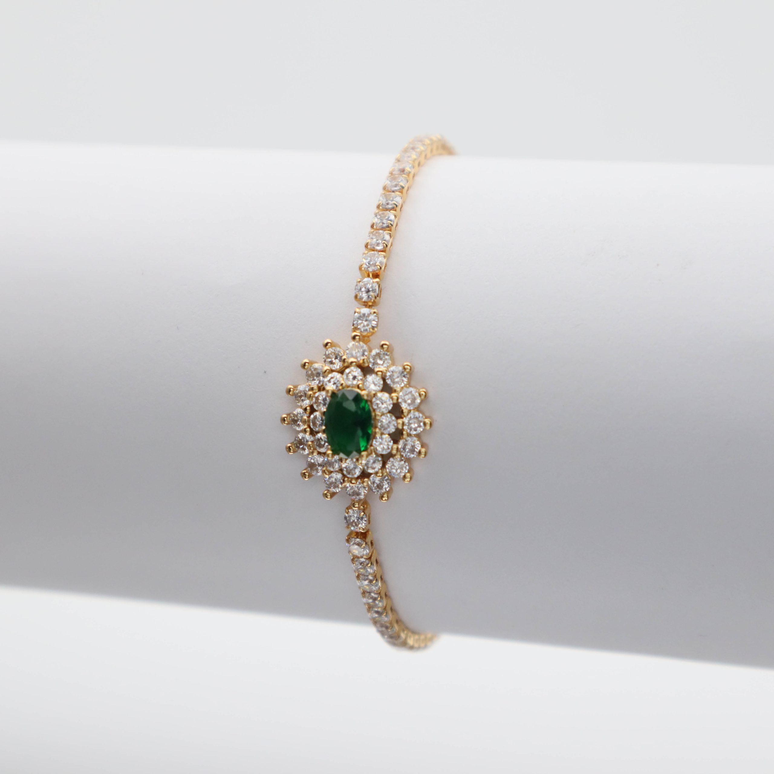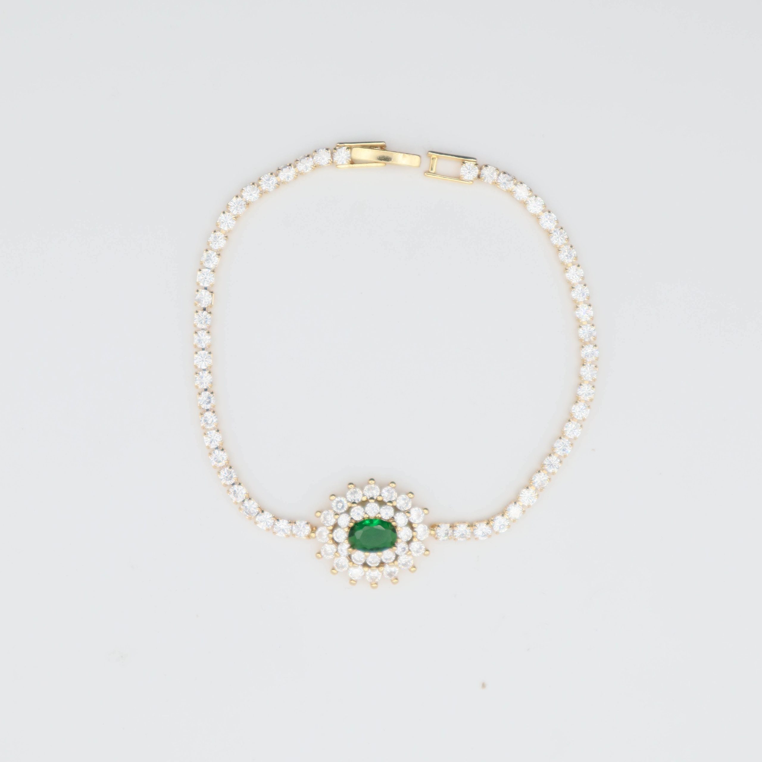 A wonderful bracelet made of zircon beads, with a green crystal in the middle, for your wonderful look.